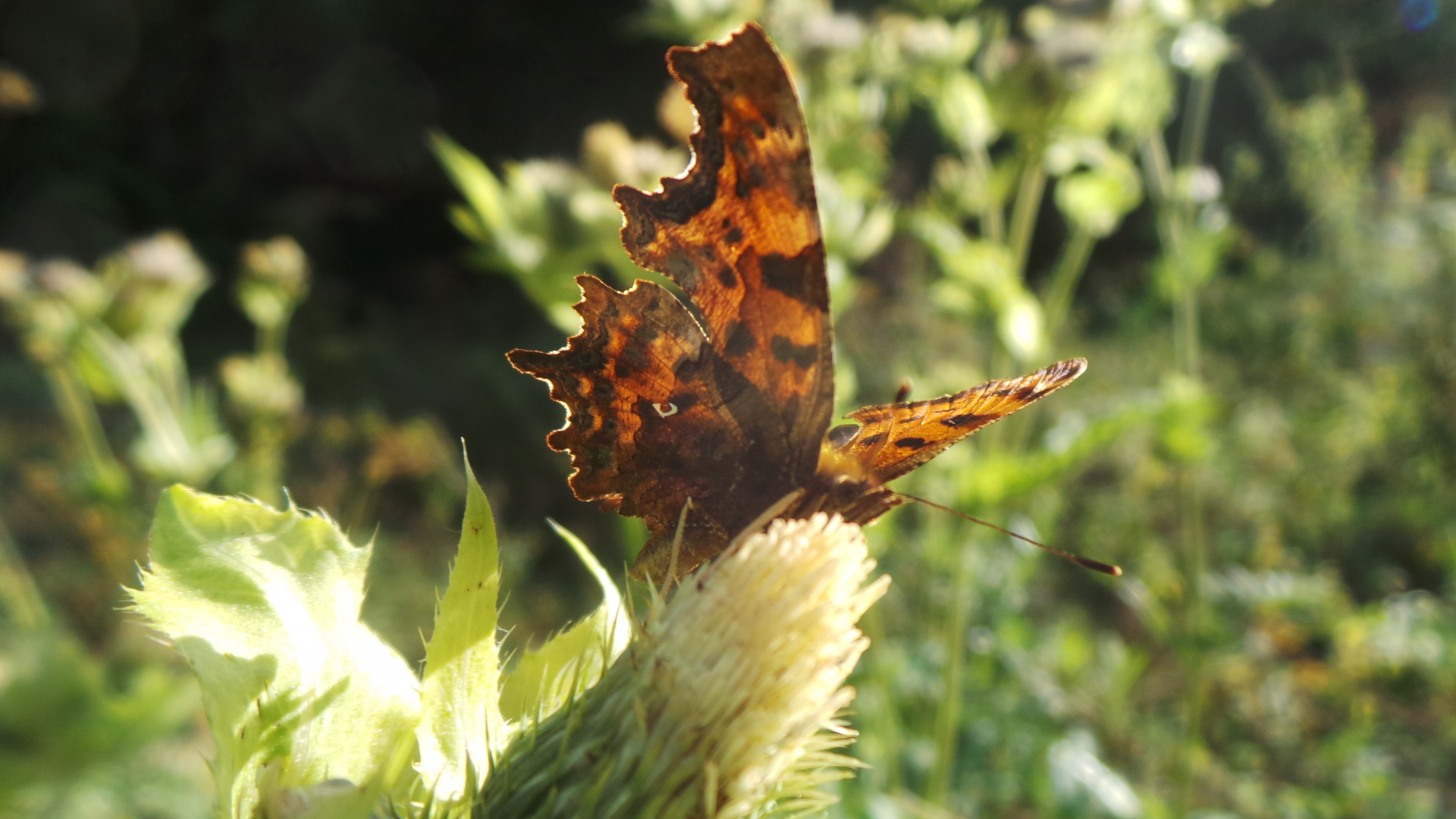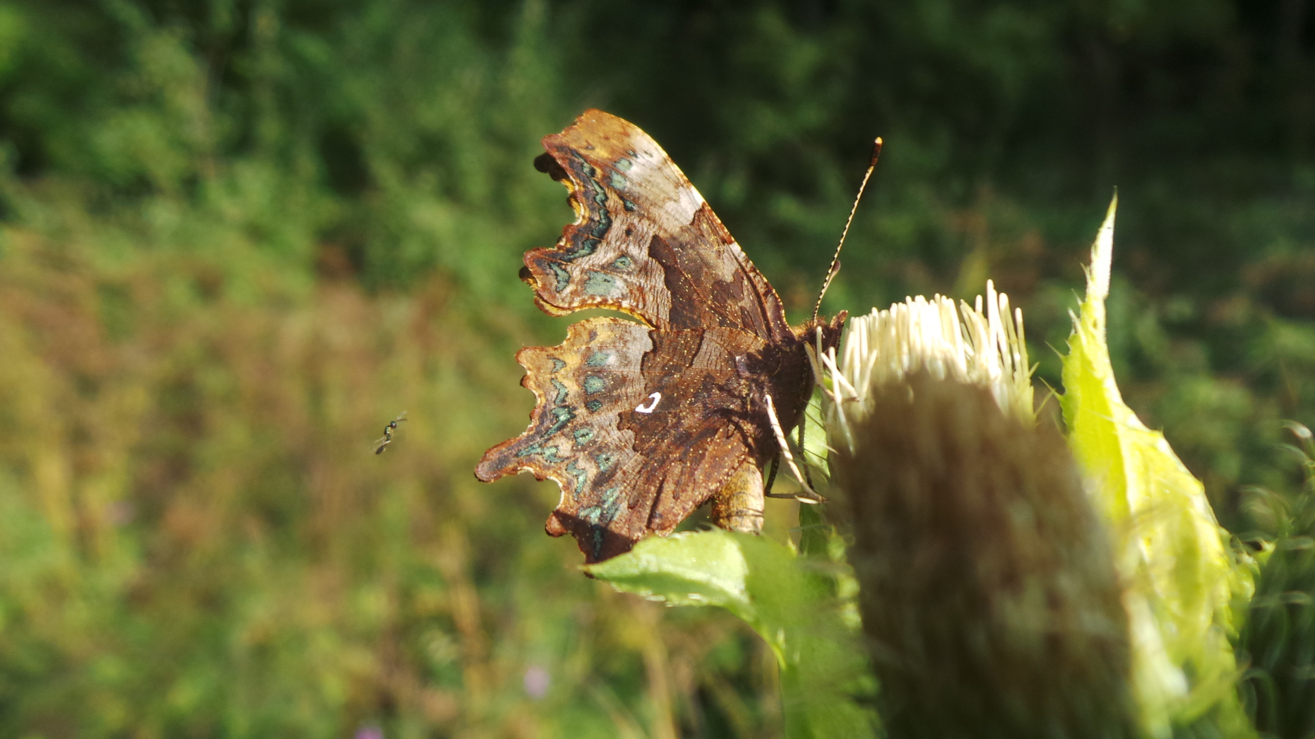 wenn einen der Hafer sticht und man so seltsame Dinge macht, wie bei 30°C im Schatten im Wald und den Wiesen herumzulaufen sieht man beispielsweise einen C-Falter (Polygonia c-album) auf einer Kohldistel :