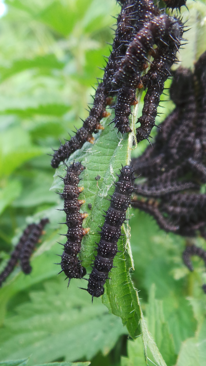 da sind die Dornen verzweigt wärend sie bei den Tagpfauenaugenraupen nur spitz sind.