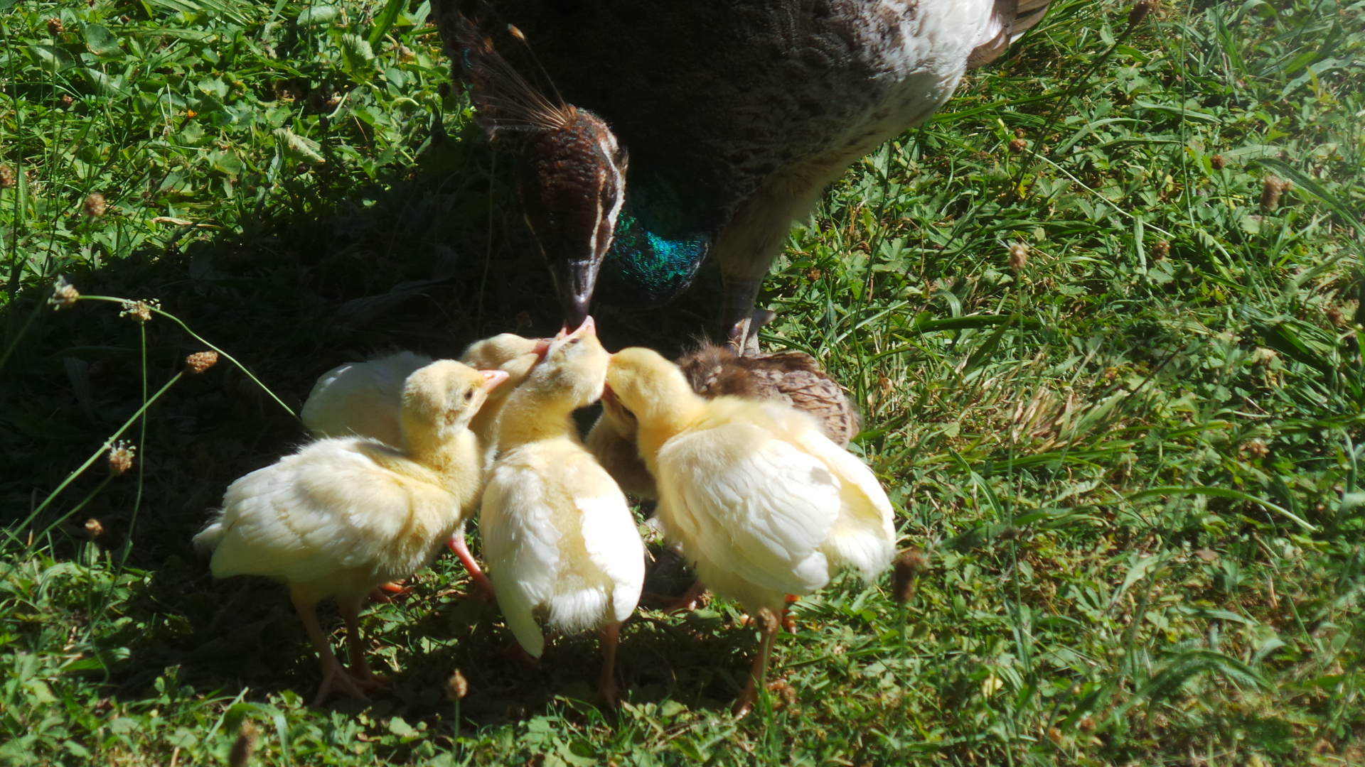 Die Pfauenmama hat erfolgreich fünf Eier bebrütet: