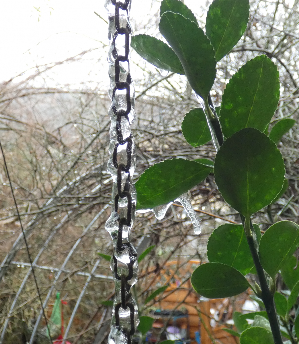 Die ganze Kette ist zum Eisgebilde geworden, und auch an den Ästen und Blättern des benachbarten Strauchs bildeten sich die kleinen Eiszapfen...