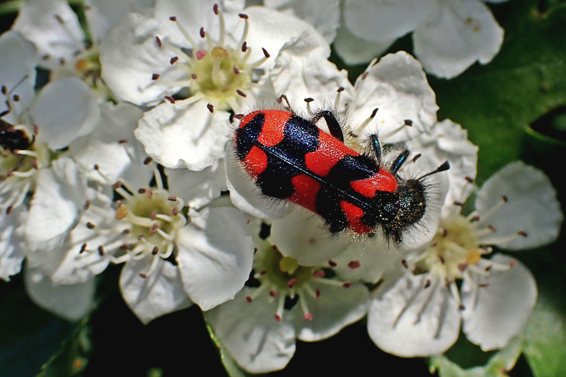 Gestern entdeckt: Bienenwolf, Zottiger Bienenkäfer (Trichodes alvearius) an Eingriffligem Weißdorn (Crataegus monogyna).