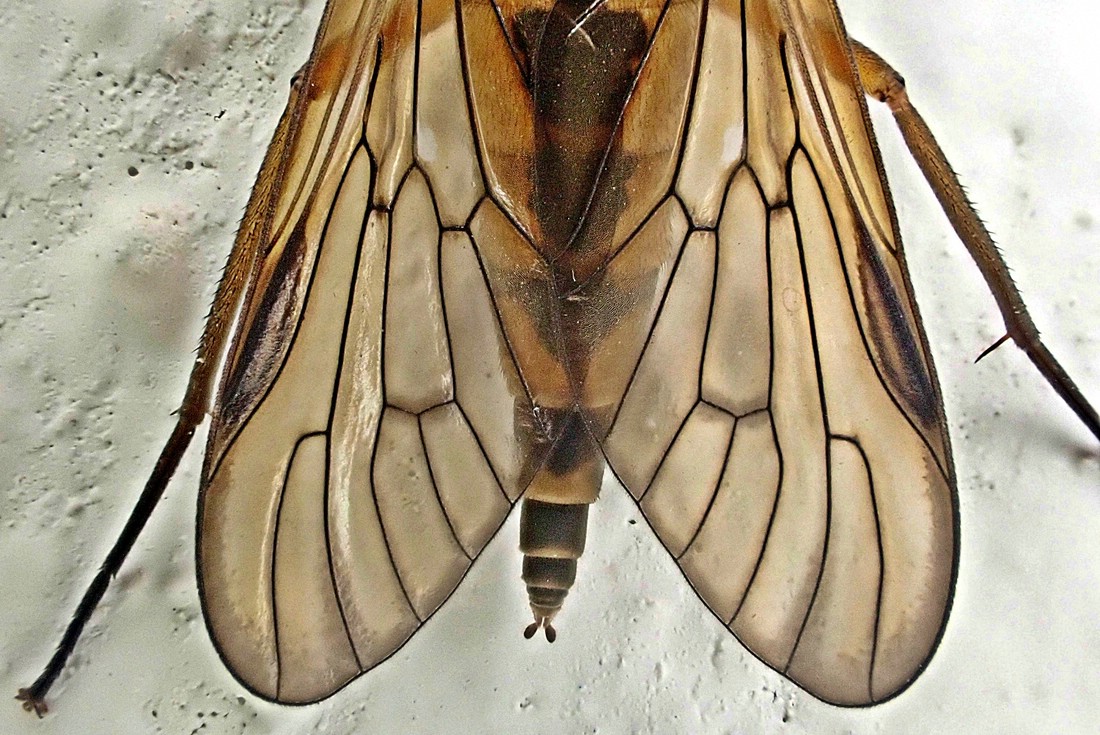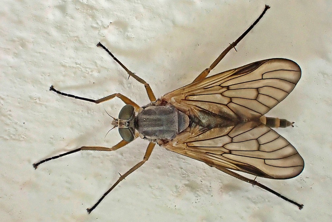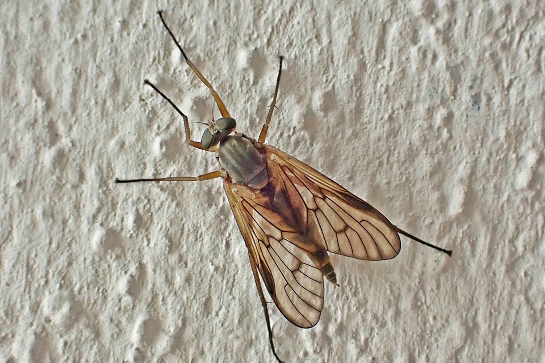Da ist zum einen eine Schnepfenfliege, vermutlich die Schwarzfüßige (Rhagio vitripennis), entdeckt am Putz neben unserer Haustür.