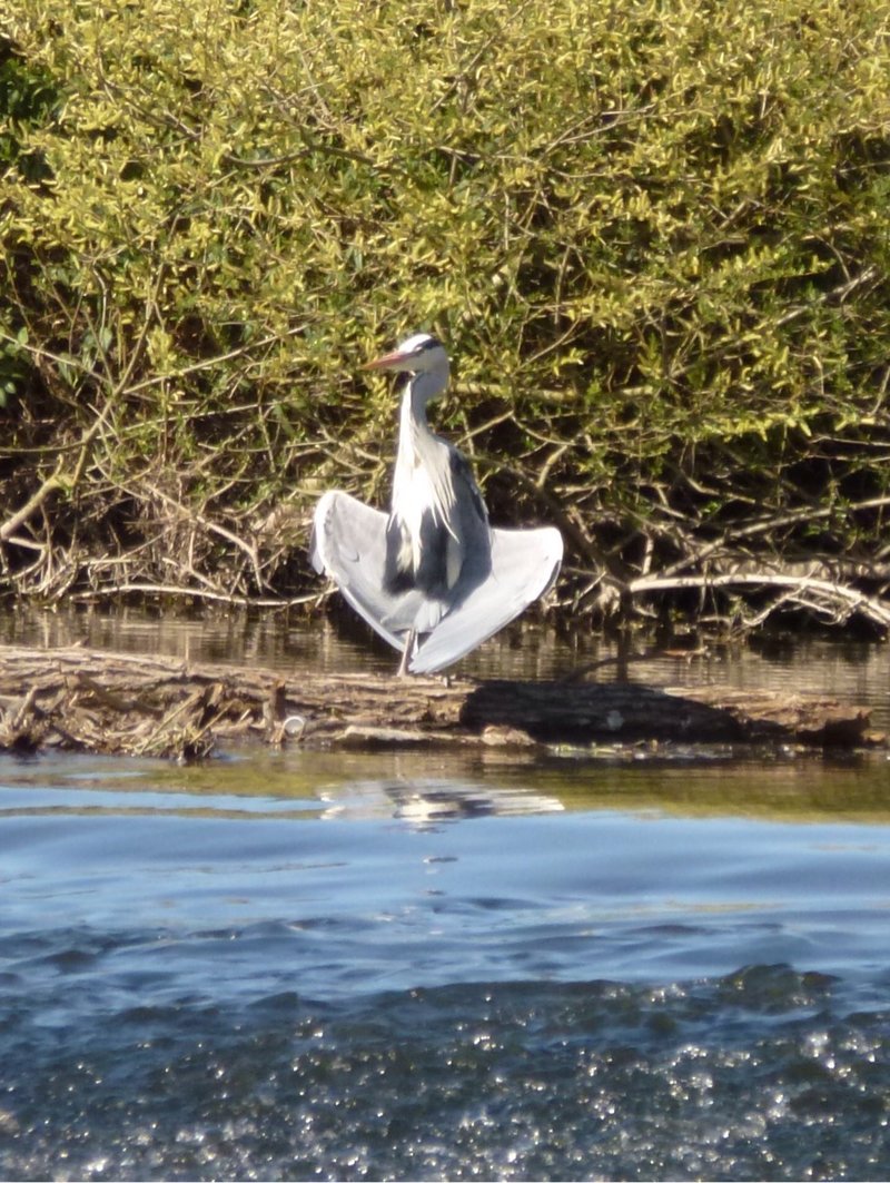 Oh, ich habe auch noch einen Reiher, ich habe noch nie gesehen, dass sich einer so verhält. Vermutlich trocknet er nur sein Gefieder, aber wie der so dasteht…