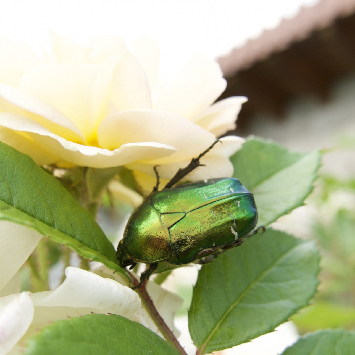 Ja, er futtert neben Nektar auch an den Blüten der Rosen, aber sie sind so schön, und ich habe so viele Rosen, da nehme ich das in kauf.