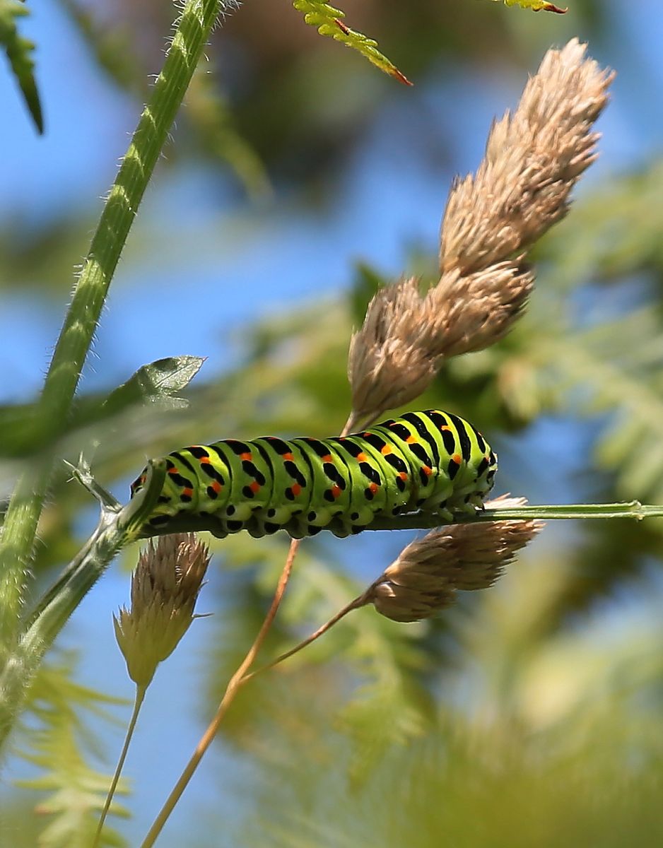 Diese Schwalbenschwanzraupe war im Vorbeigehen eigentlich unmöglich zu finden, aber es ist wie beim Pilzesuchen: Man nimmt ihm Augenwinkel etwas wahr, das leicht vom Standard abweicht und schaut genauer nach. Da habe ich diesen bunten Vogel gefunden.