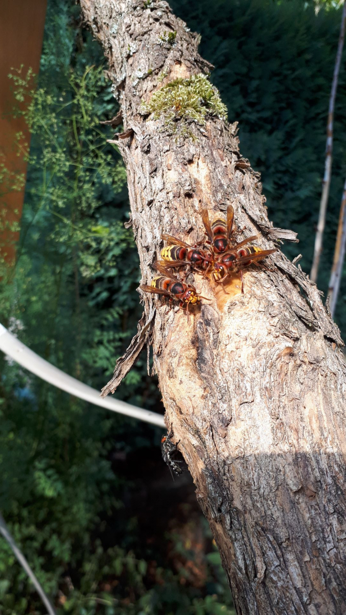Die 4 wollten unbedingt aufs Foto - die anderen flogen weg. Es sind manchmal bis zu 15 Hornissen, welche sich an dem nun schon entrindeten Stück laben.