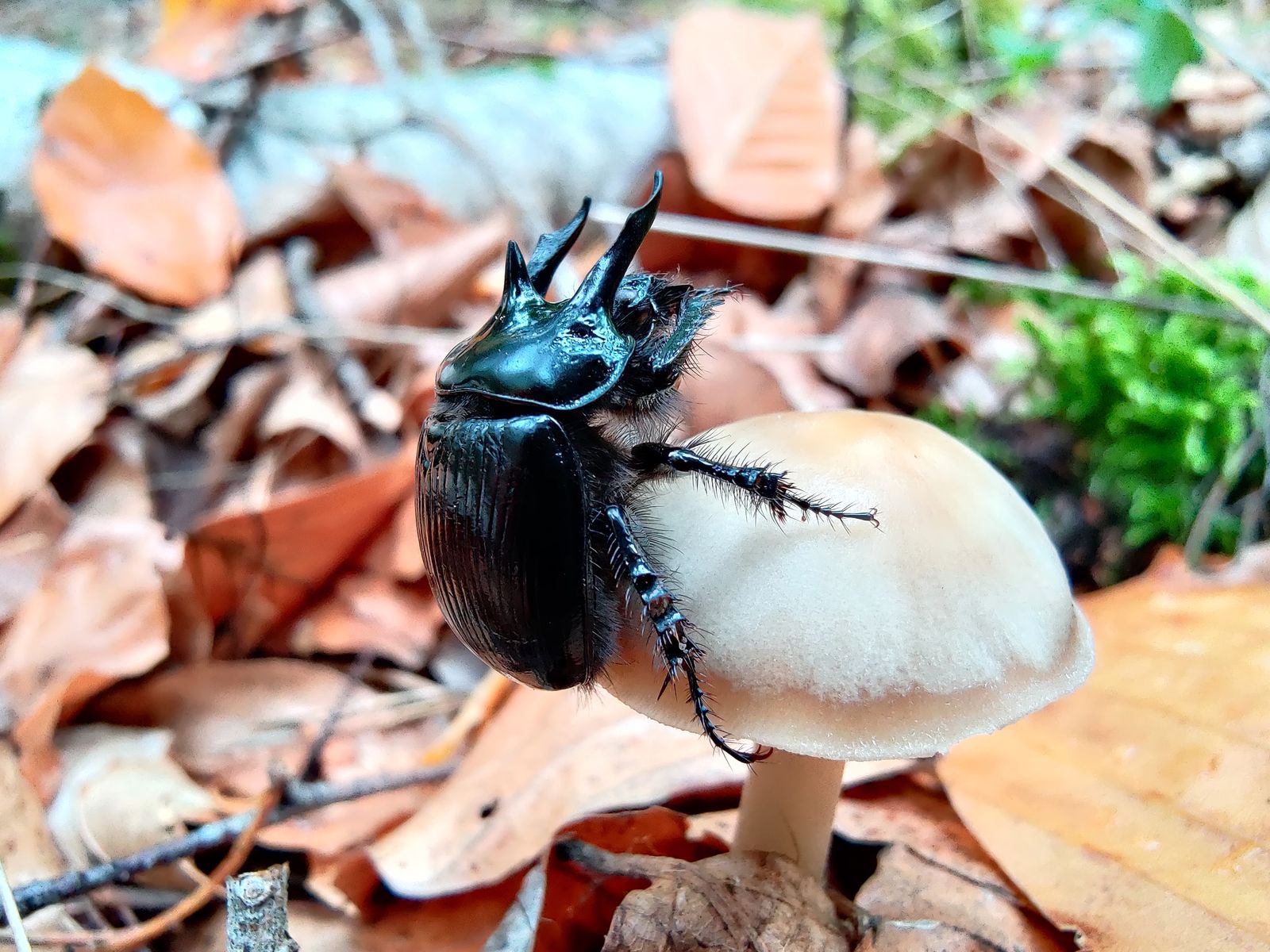 gestern zum ersten Mal entdeckt. Ich ging erst vorbei, in dem Glauben es sei ein 'normaler' Waldmistkäfer. Bin dann aber doch nochmal zurück und dachte es lohnt sich, mit dem Makromodus des Smartphones den Käfer, der es sich auf dem Pilzchen gemütlich gemacht hatte zu fotografieren... dann hatte der auf einmal Hörner. Ein männlicher Stierkäfer - Anoplotrupes stercorosus: