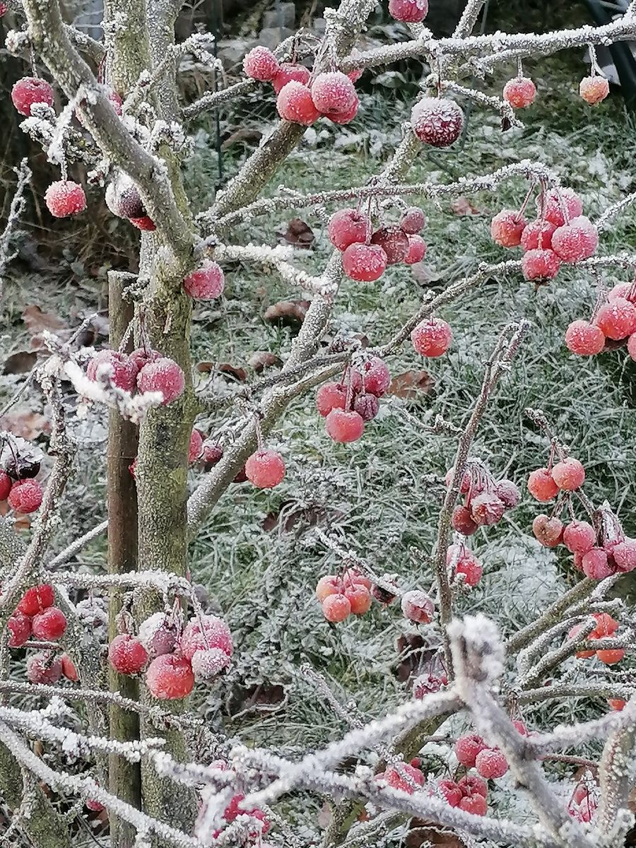 Alles was draußen ist, hat dicke weiße Panzer. Heute in der Sonne ist einiges schon getaut, im Schatten nicht. Hoffentlich bekommen wir keine Sturm, das würde Windbruch ohne Ende bedeuten.