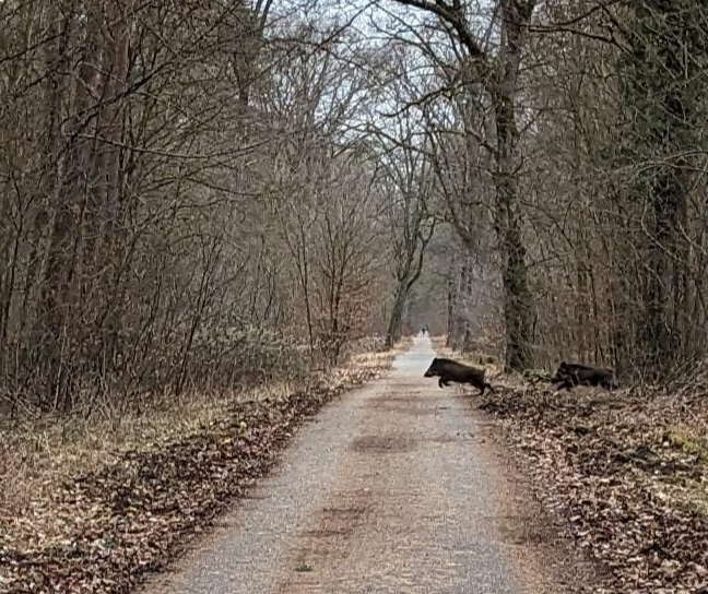 Bis ich das Handy startklar hatte waren die beiden alten Wildschweine schon nach links weg. Im Bild zu sehen sind Nrr. 3 und 4 von den Jungen.
