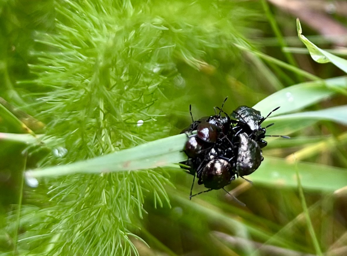 das sind Nymphen von Baumwanzen (Pentatomidae). Nach dem Schlüpfen bleiben die noch eine Weile zusammen (Wanzenkinderkuscheln :gzwinkern: ).