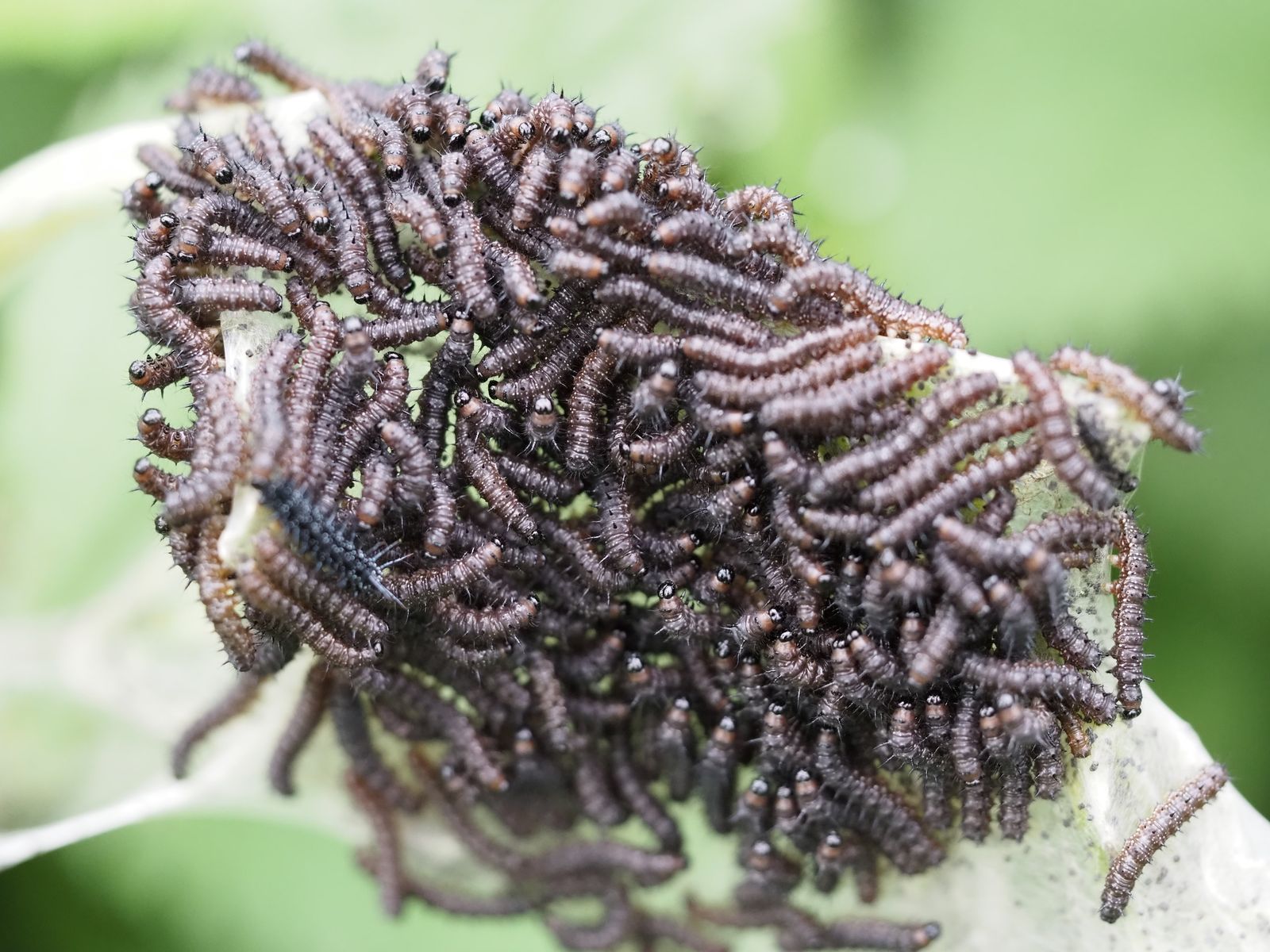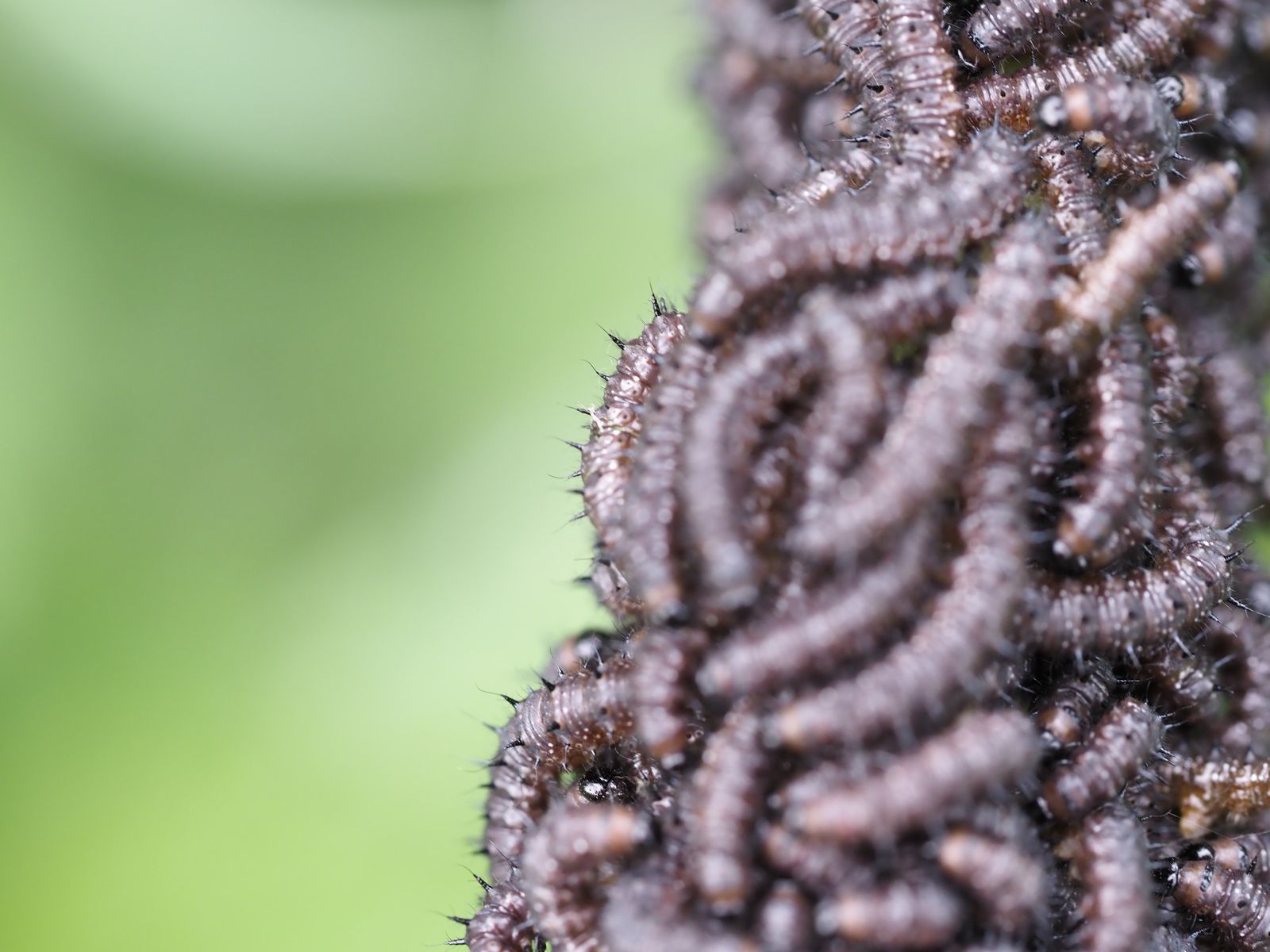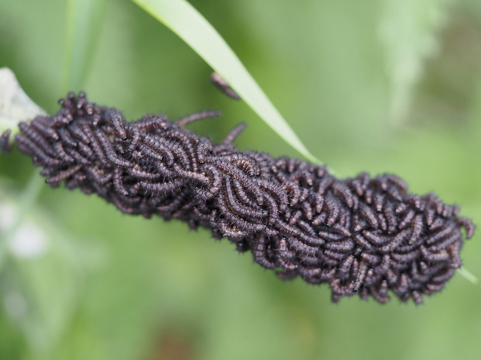 Daher nachstehend ein paar Fotos von Raupenansammlungen auf Brennnessel, die ich bei erfolgloser Pilzsuche geschossen habe und nicht zuordnen kann: