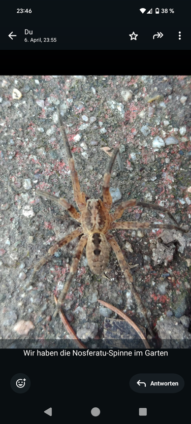 • Sie fiel mir wegen der Größe auf. Ich dachte zwar zuerst, es sei ein helle Hausspinne, habe dann aber etwas genauer geguckt. Keine Ahnung, seit wann sie schon bei uns lebt, hier im Raum stuttgart.