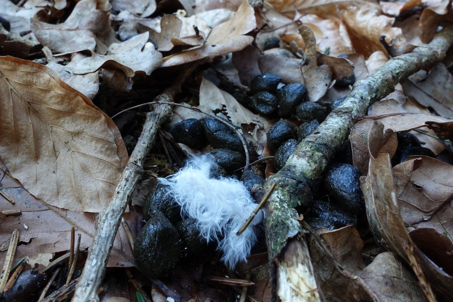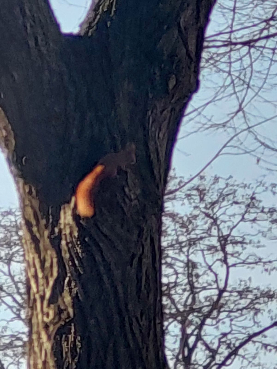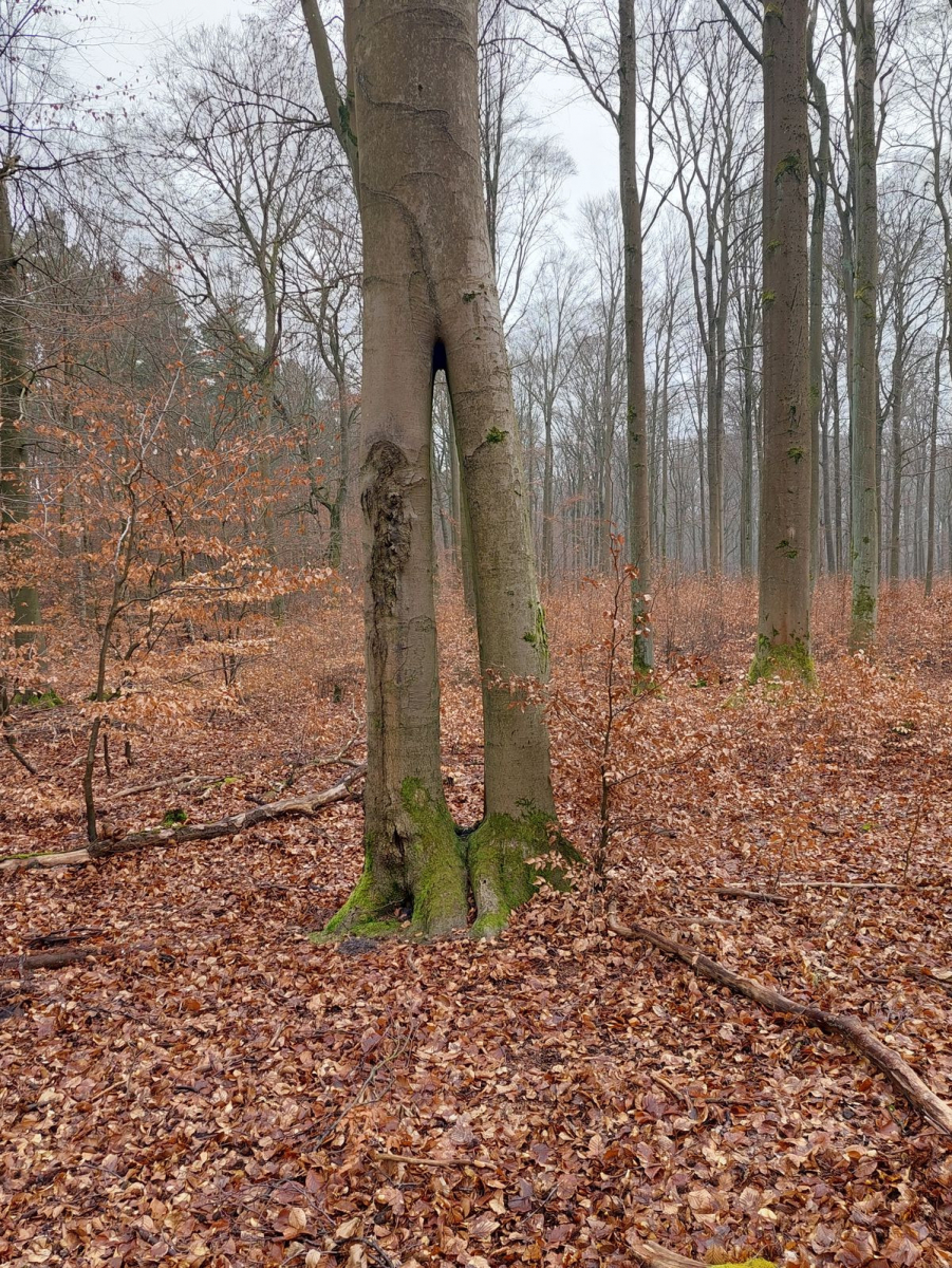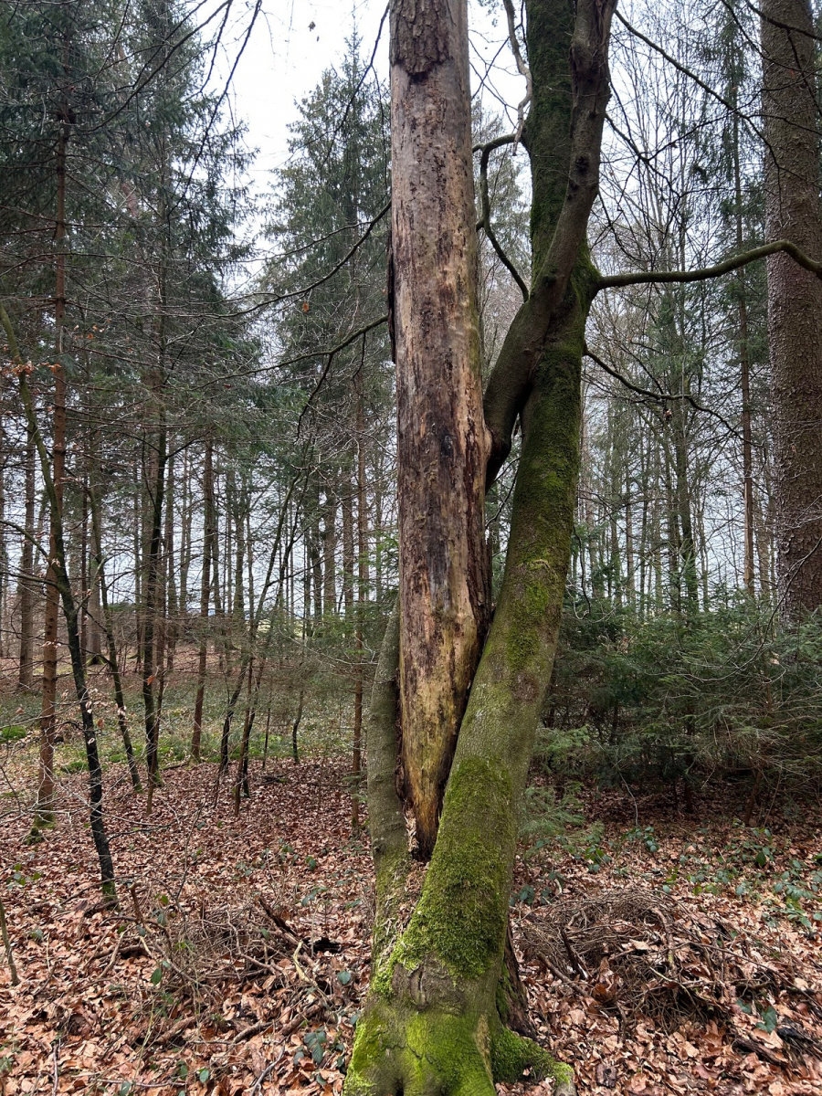 Der Schwarzspecht saß völlig regungslos in dieser Position an dem Stamm, ohne jegliche Bewegung, bestimmt 15 Minuten. Zuerst dachte ich, da hat sich jemand einen Spaß erlaubt und einen Vogel aus Kunststoff o.ä. da ran gehängt. Erst auf dem Rückweg war der Specht fleißig auf Nahrungssuche an einem liegenden Stamm.