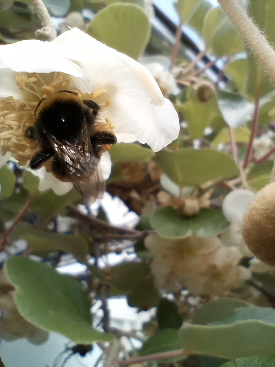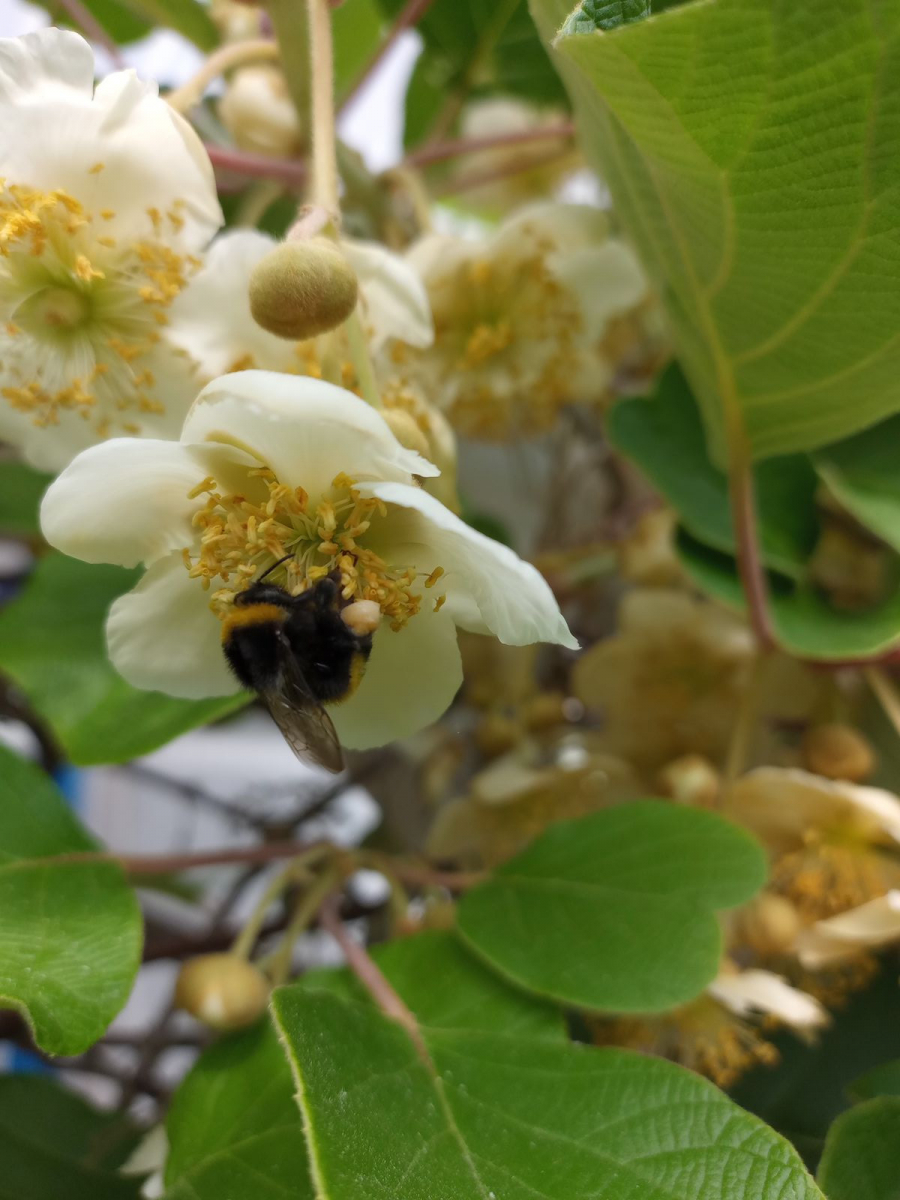 hier geht gerade der Punk auf der Terrasse ab, weil der Kiwi blüht. Jedes Jahr lockt das eine Myriade von Hummeln an, es summt und brummt in vielstimmigem Chor.