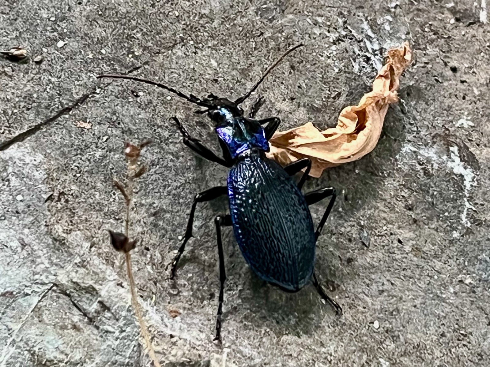 Weil ich keine Mückenzucht haben will, musste der Wasserbottich entleert werden. Der Dunkelblaue Laufkäfer war not amused. Das Blatt stört, aber als ich es wegnahm, war auch der Käfer weg.