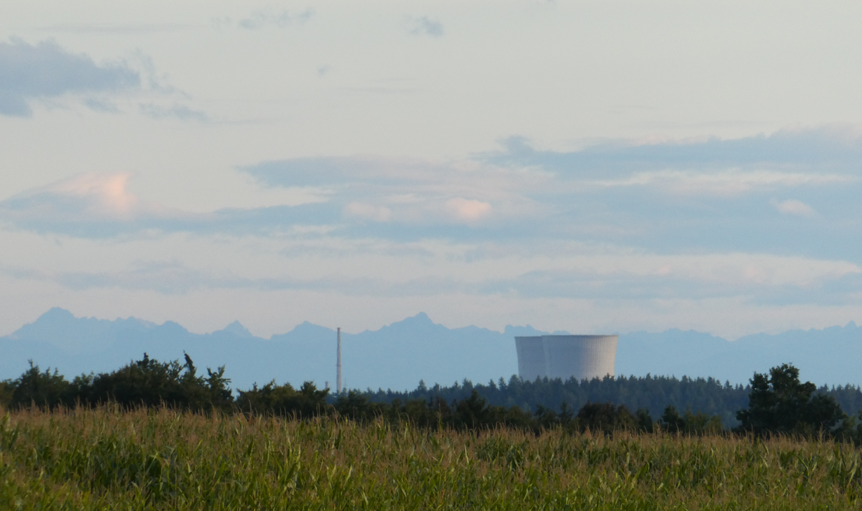 Mit den beiden demnächst gesprengten Kühltürmen des Kernkraftwerks Grundremmingen (Luftlinie ca 21 km) und den Alpen (Luftlinie ca 150 km):