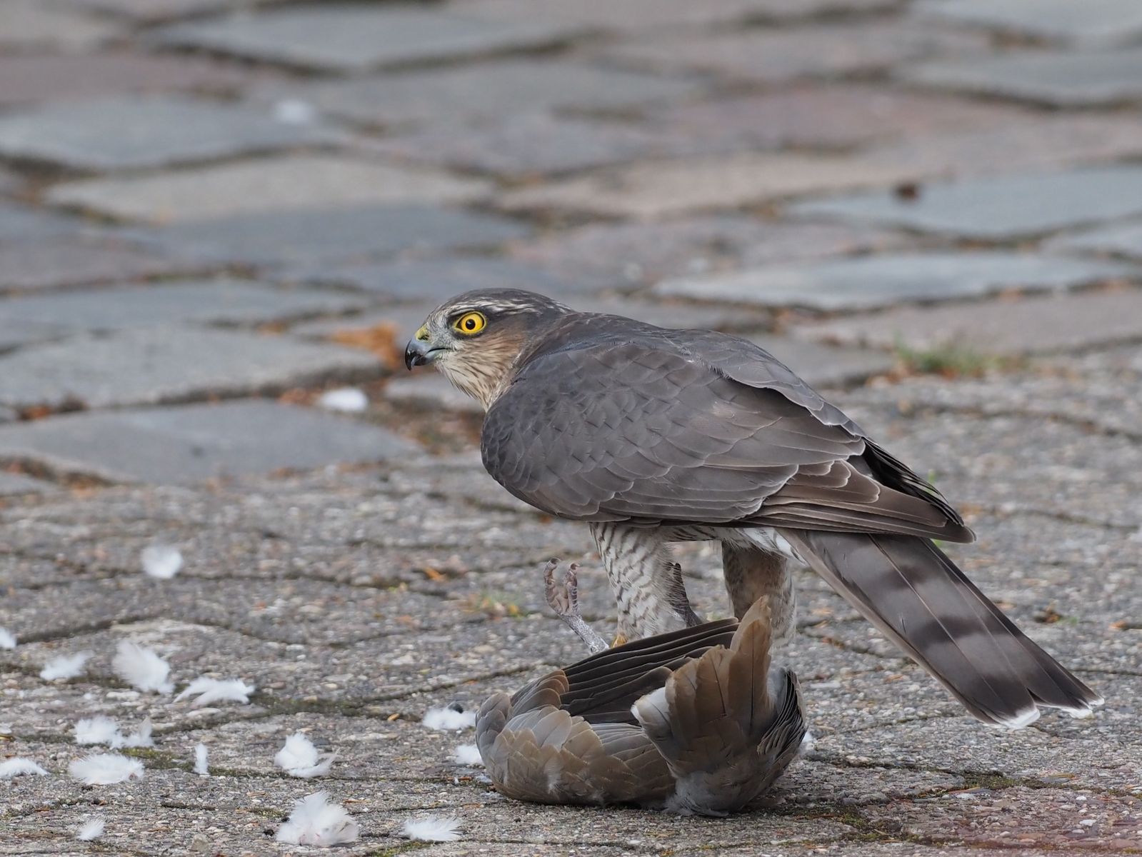 Als ich mich langsam zurückzog, strich der Sperber mit seiner schweren Beute ab und verschwand hinter Häusern.