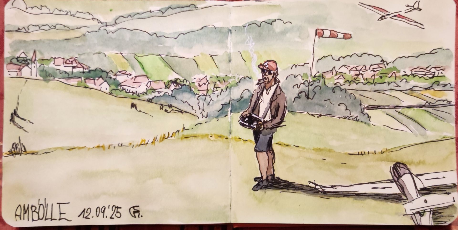 Ich machte einen schnellen Sketch eines anderen Modellfliegers (den ich insgeheim "Mr. Cool" taufte), ebenfalls dort am Lieblingsplatz der Modellsegler.