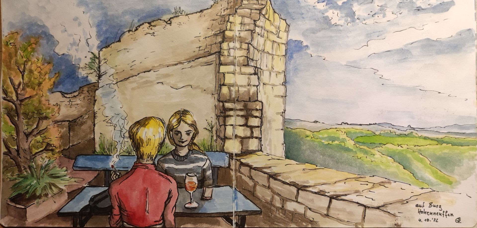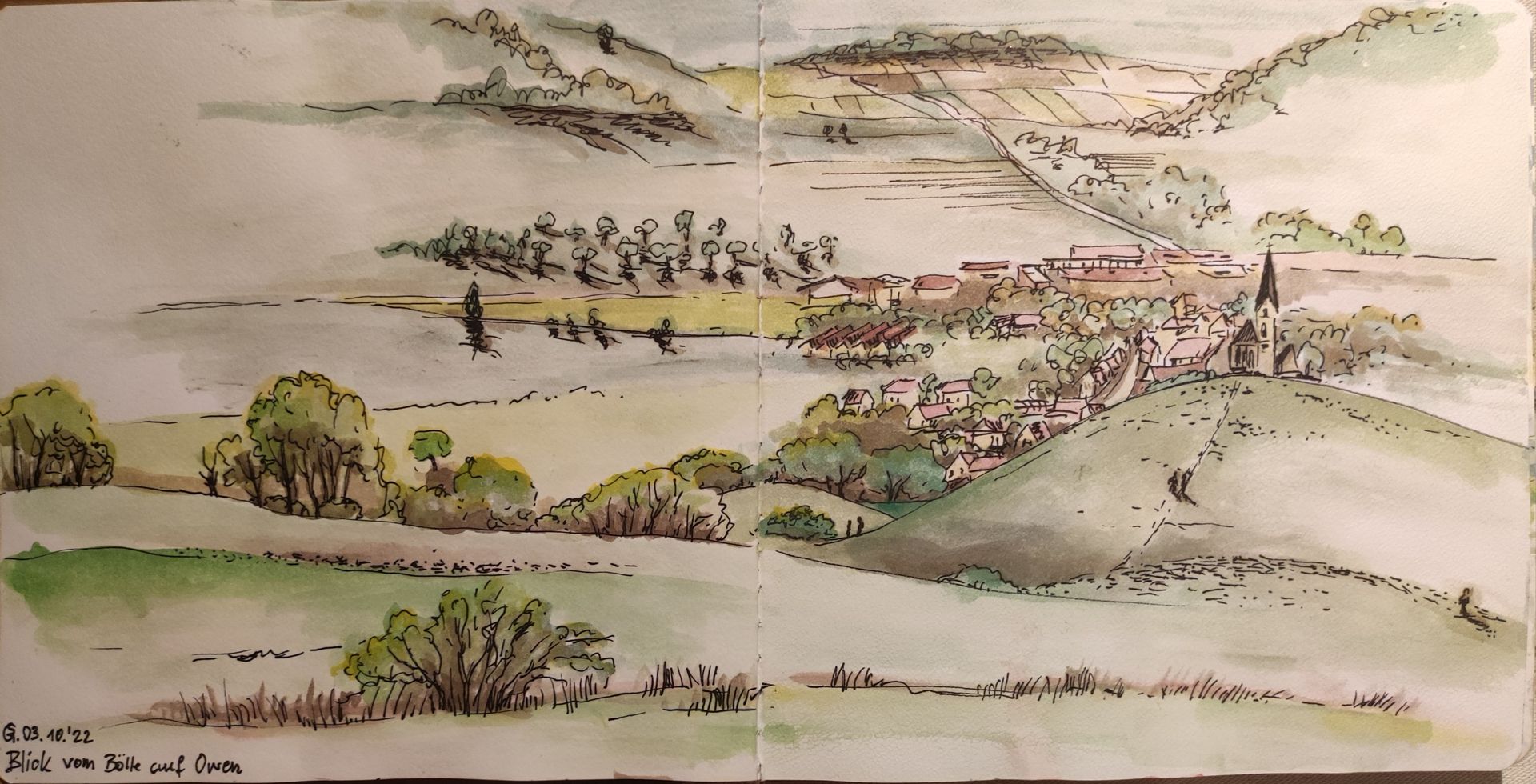 In der rechten Bildhälfte Blick auf den Albtrauf. (Die Damen waren Fremde, die mitskizziert wurden, weil sie eben da saßen...)