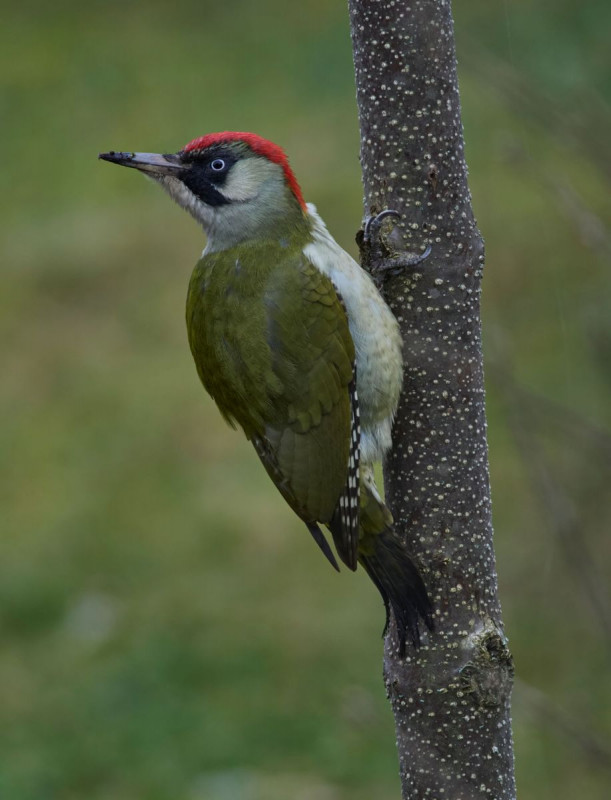 ein adultes Grünspecht-Weibchen (der Wangenstreif ist schwarz, bei Männchen ist die Wangenstreifmitte rot)