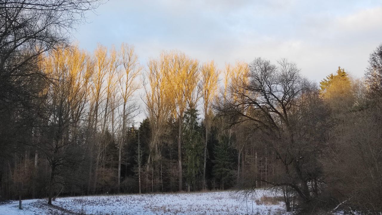 Man beachte hier die von der tiefstehenden Nachmittagssonne golden angeleuchteten Baumwipfel.