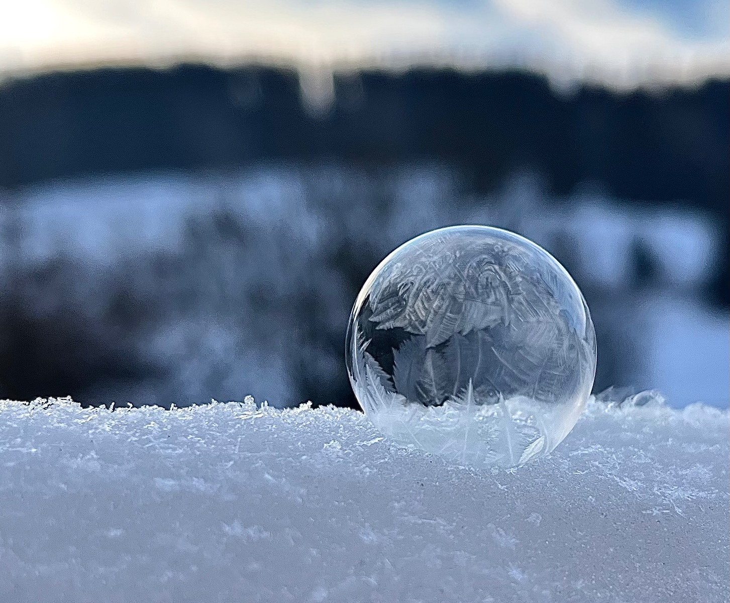 Liebe Grüni, Grüni/Kagi, die gefällt mir auch am besten. Da war die Seifenlauge ziemlich kalt, aber noch nicht halbgefroren. Es habe zahlreiche Kristallisationspunkte entwickelt, aber nicht zu viele. Als die Brühe schon zu Brei gefroren war, bildeten sich zu viele solcher Punkte und die Kugeln waren sofort durchgefroren. die Kunst ist, schnell zu sein. Seifenblase machen, Handy zücken, vor dunklem Hintergrund knipsen. Irgendwas geht meist schief. Am Ende sind die Finger starr. 25 Versuche, ein brauchbares Foto. Aber der Aufwand hat sich gelohnt.