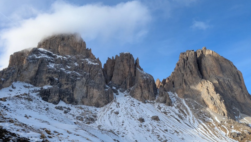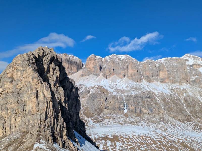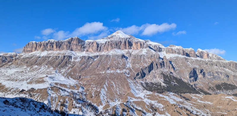 Auch die Pordoischarte ist schneefrei, Ende Januar, dahinter in der Holzerrinne liegt zu wenig Schnee, als dass man die Abseilstelle springen könnte.