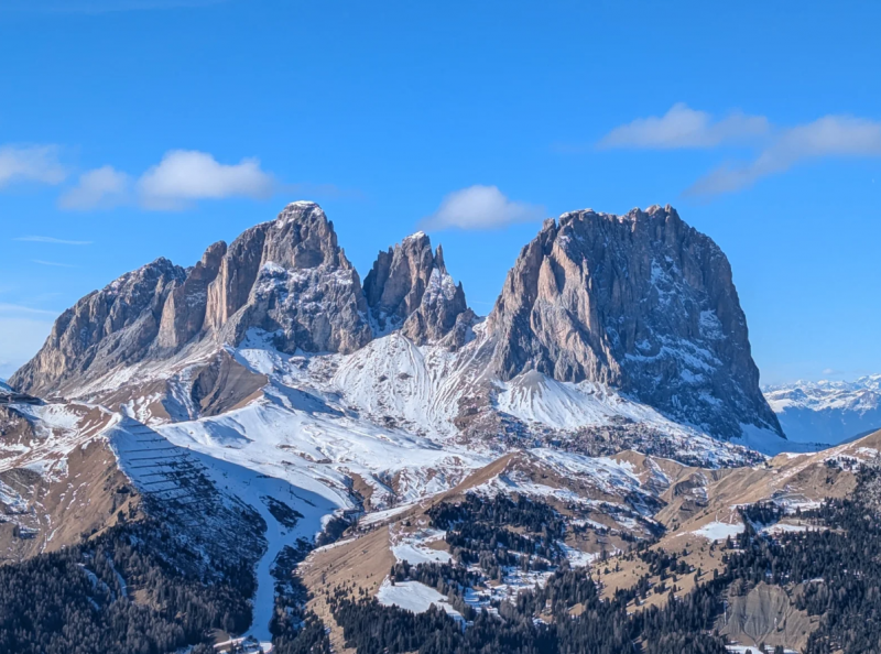 Blick von SO auf Grohmannspitze, Fünffingerspitze und den Langkofel. Die Abfahrt von der Langkofelscharte mit Skiern ist wegen Schneemangels nicht möglich:
