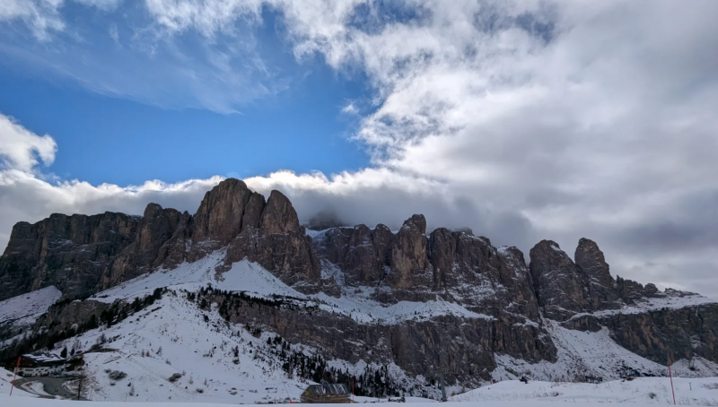 Der Sellastock von Norden, unten links das Grödner Joch: