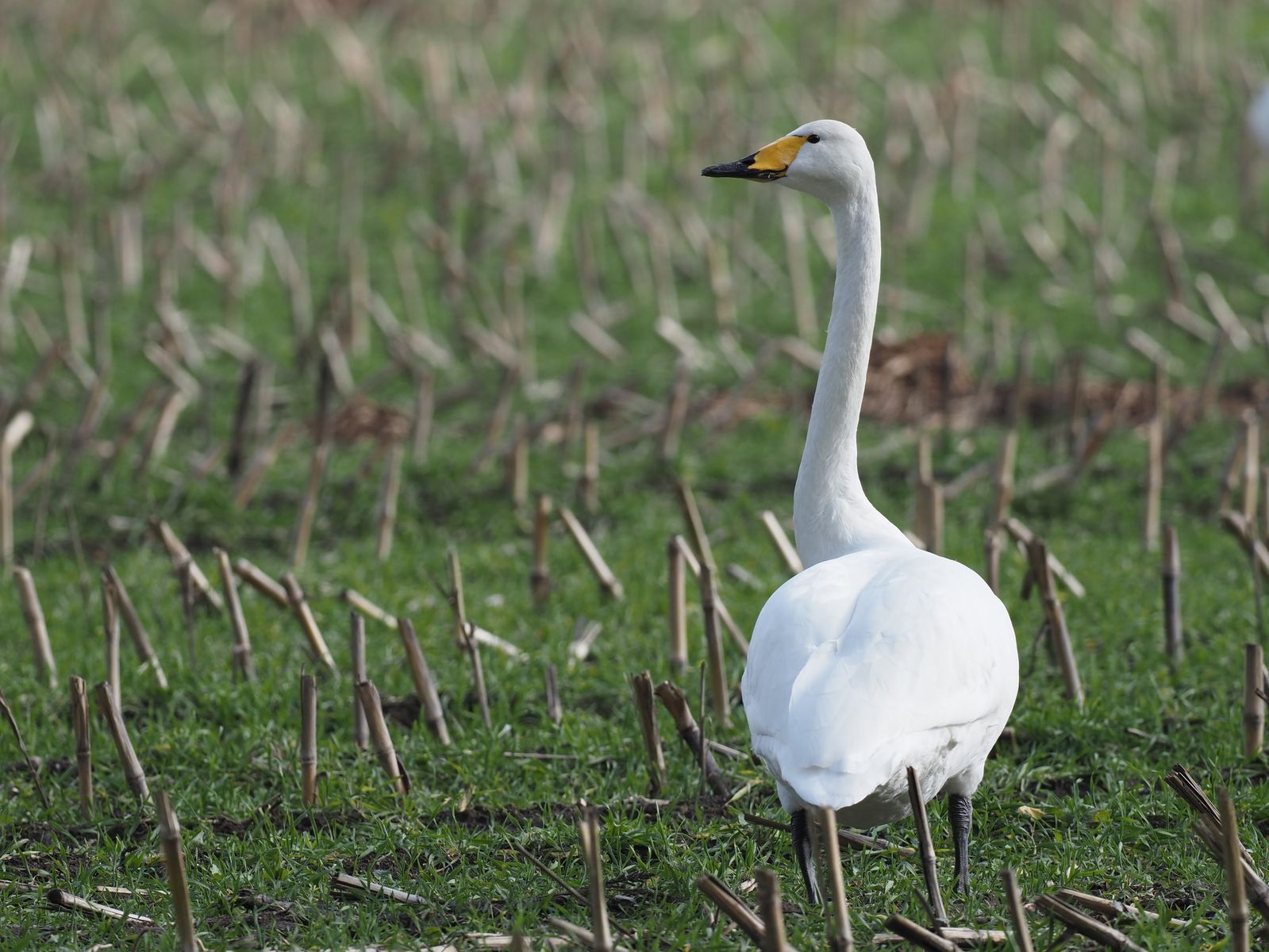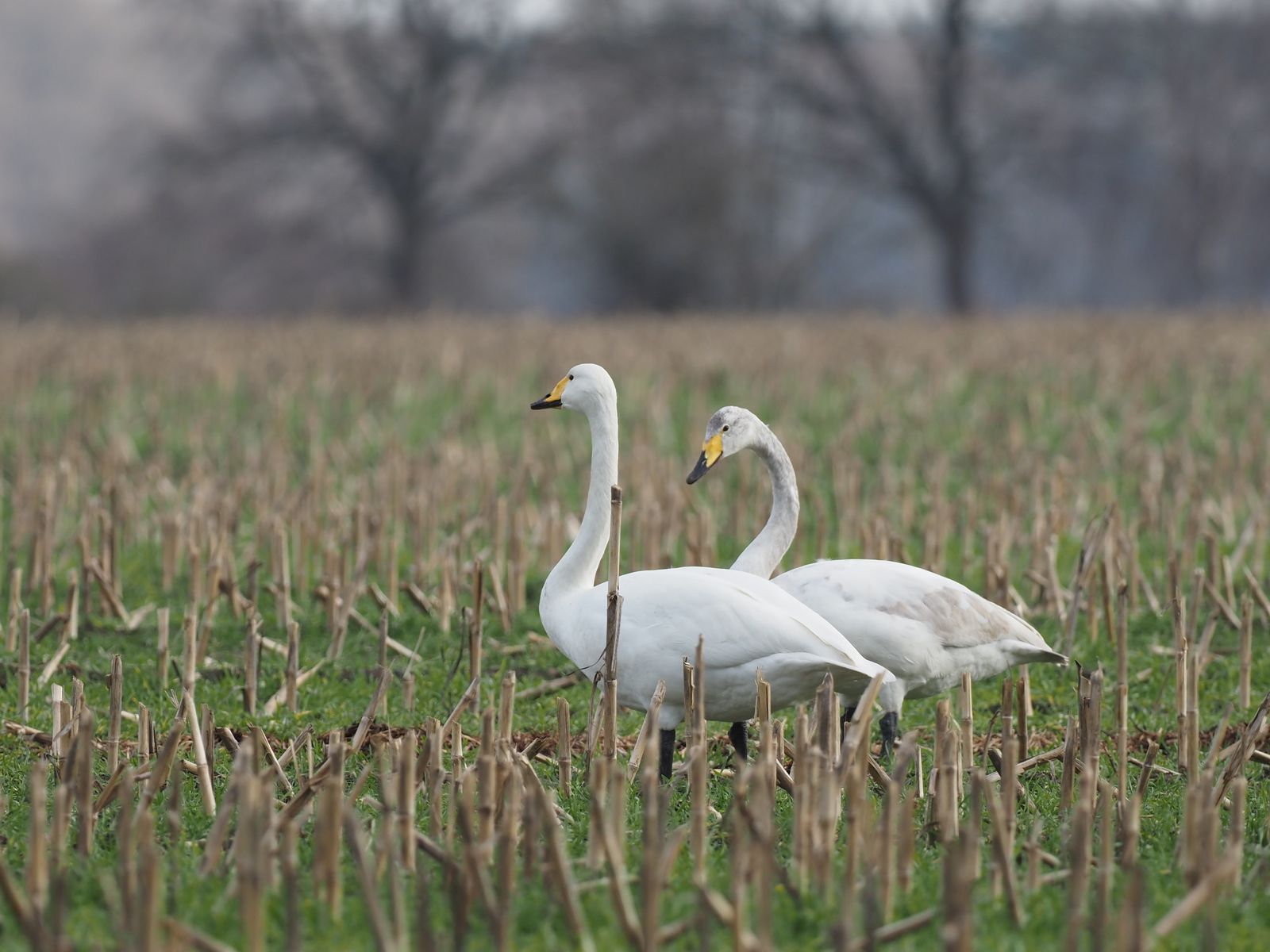 bei uns erlebt man zur Zeit wieder den Rückzug der Zugvögel in ihre nordöstlich gelegenen Brutreviere. Außer Kranichen und verschiedenen Gänsearten sind auf hauptsächlich Maisstoppeln mehr oder weniger große Ansammlungen von Sing- und Zwergschwänen zu beobachten. Die von mir fotografierten Singschwäne sind relativ wenig scheu und lassen sich auf ca. 50 Meter gut knipsen. Die rein weißen Schwäne sind Altvögel, während die noch etwas grauen Jungvögel sind.