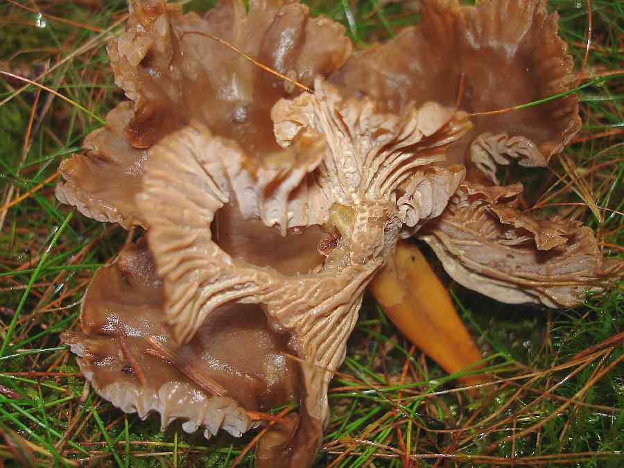 Lamellen: creme bis ockerlich, +-dichtstehend, leicht ausgebuchtet angewachsen, evtl. mit wenigen Zwischenlamellen/Lamellengabelungen