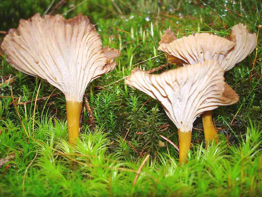 Lamellen: creme bis ockerlich, +-dichtstehend, leicht ausgebuchtet angewachsen, evtl. mit wenigen Zwischenlamellen/Lamellengabelungen