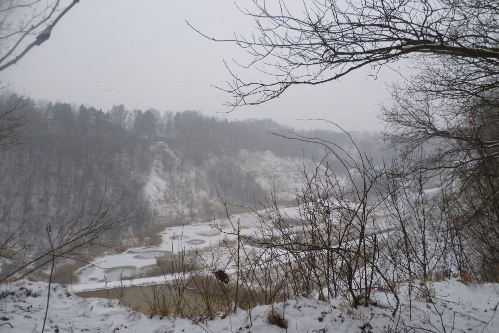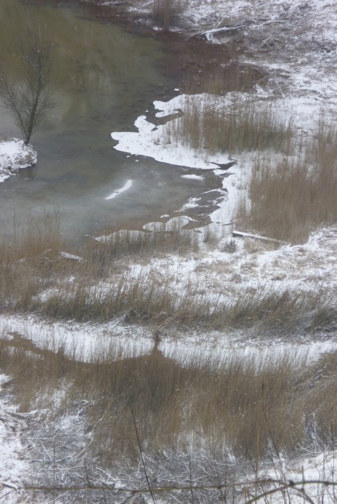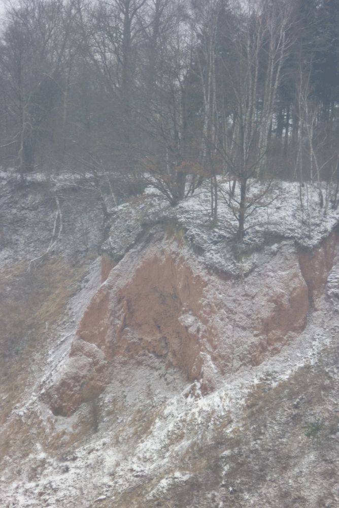 Zwischendurch ein Blick in die Kalkgrube. Wir hatten gerade ein paar schwer mit tiefgefrorenen Ohren behangene Holundersträucher begutachtet. Kuschel und ich fanden frische Spuren im Schnee, die bis an den Abgrund gingen ... unten links im Bild. Kuschel, gingen die eigentlich auch wieder zurück?