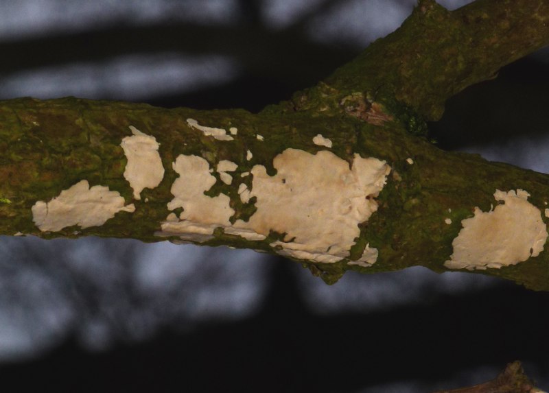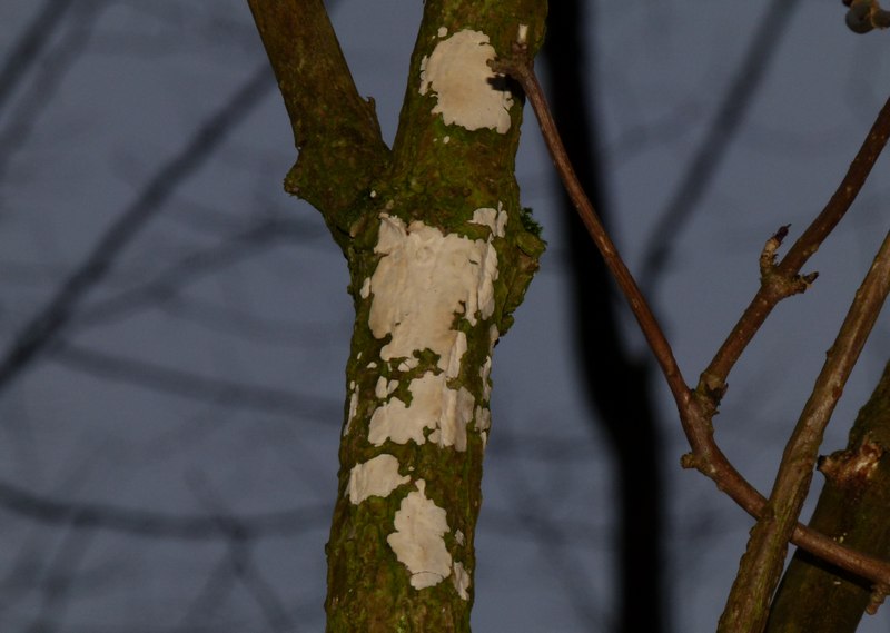 nur, dass einfache Leute auch ohne zu googlen wissen um was es geht: Weißer Holunderrindenpilz (Rogersella/Hyphodontia sambuci).