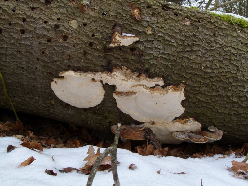 Heute in einem Wald bei Hamburg, auf einem umgestürzten Laubbaum mit grober Borke.