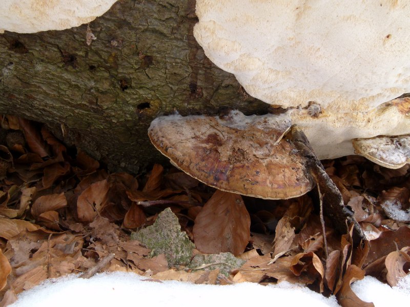 Die roten (und schwarzen) Kugeln dürften Rötliche Kohlenbeere (Hypoxylon fragiforme) sein. Läßt sich zu dem resupinaten Pilz etwas sagen, der unten auch einen Hut ausgebildet hat?