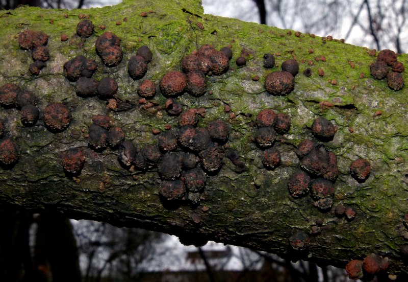 Leider habe ich den Ast mit den Kohlenbeeren nicht mitgenommen. Und für's nähere Untersuchen oder genauere Fotos ist manchmal keine Zeit, vor allem wenn man in pilzuninteressierter Begleitung ist