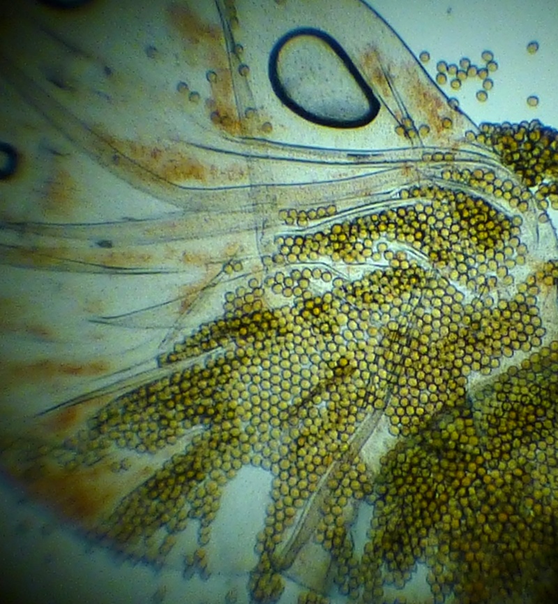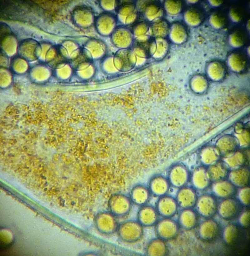 Bei der Gattung vermute ich Pilobolus aber bei der Art komm ich nicht wirklich weiter.Kann es sein das die Sporen eiförmig sind und jenachdem wie sie liegen mal rund und mal eiförmig erscheinen?