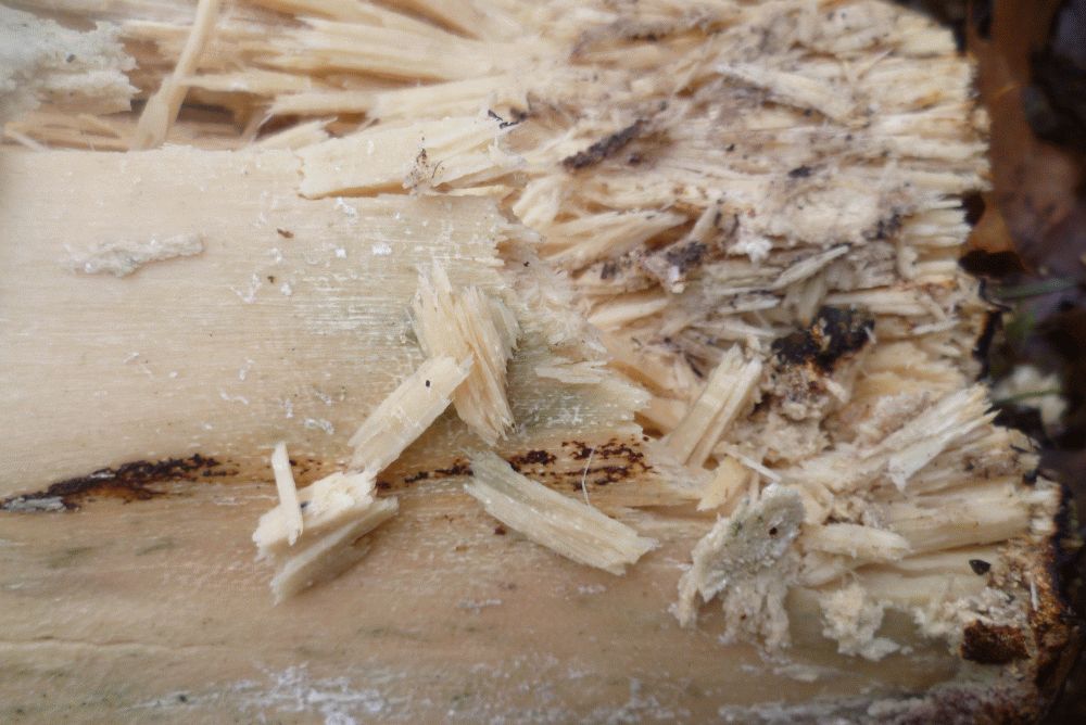 Weißfäule erkennt man daran, dass es in länglische Fasern zerfällt, man kann es zerdrücken und es ist sehr feucht. Im Prinzip ähnelt die Konsistenz einem Schwamm. Und es ist eben typisch weißlich gefärbt.