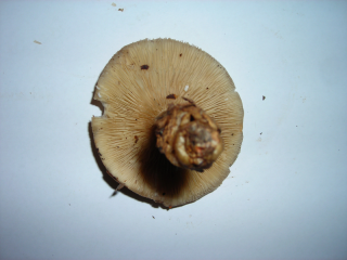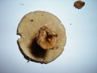 Beim zweiten Pilz glaube ich einen horngrauen Rübling vor mir zu haben. Hut ist 6 cm breit, dünnfleischig und war am Standort dreifarbig,Hutrand war etwas heller, Hutmitte dunkler, jetz und hier erscheint er mir nur die Hutmitte dunkelbrauer. Lamellen sind heller als der Hut aber eher in diesem brauen Farbton. Stiel ist auch 6 cm lang an der Basis ist er verdickt und hohl und war weißlich, wie Myzel, von Fäden überzogen. Der Geruch dieses Exemplares ist, nun kommt der Grund meiner Zweifel, extrem süßlich, wobwei in meinem Buch von unauffälligem Geruch die Rede ist!