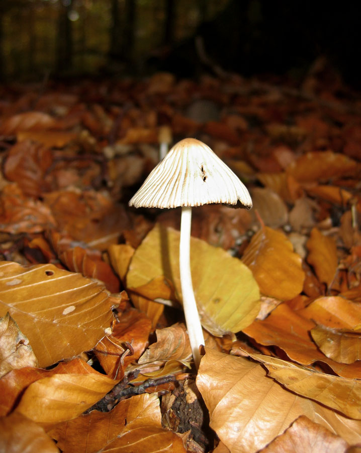 Vielleicht klappts auch so. Der Kamerad, der mich heute beschäftigt, wächst gerade in Massen in Laubwäldern (zwischen Buchen und Birken). Er wird so 8-10 cm hoch und hat einen Hutdurchmesser von etwa 1-2 cm. Die Lamellen sind schwarz. Auffällig ist der fast bis zur Mitte geriefte Hut. Blickt man von oben auf den Pilz, scheinen die schwarzen Lamellen wunderschön durch die Riefen, dass er von oben aussieht wie eine Strahlensonne. Riecht unauffällig mild, Geschmacksprobe fand nicht statt. Lässt er sich identifizieren?