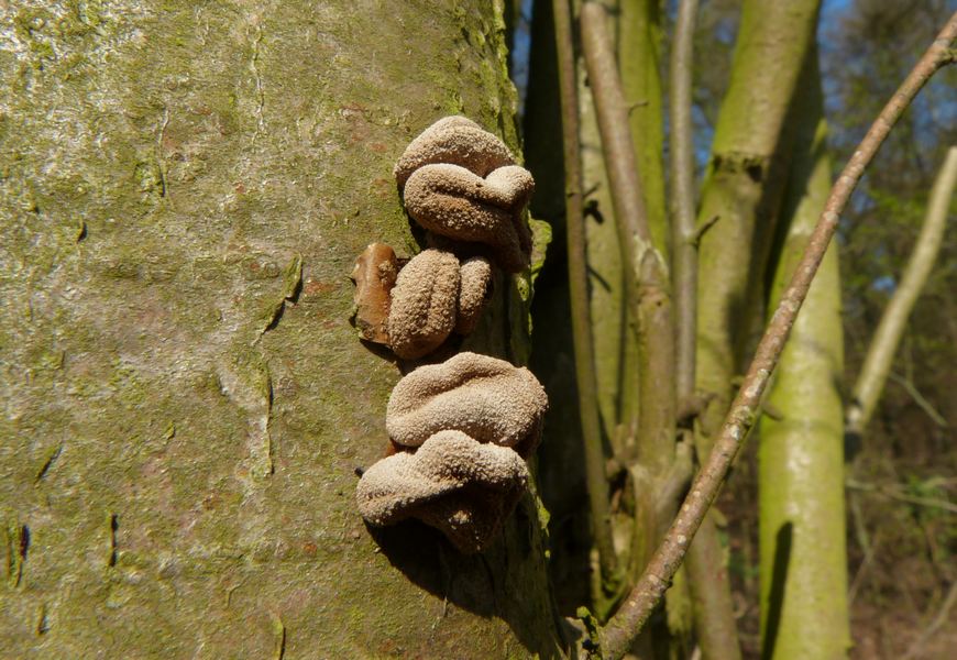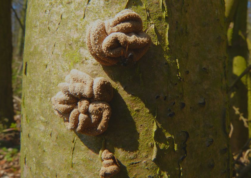 Gefunden heute am Rand eines Laubmischwaldes im Norden von Lübeck an einer relativ jungen lebenden Buche. Die Teile fühlten sich fest an, habe eines abgemacht, das war im Prinzip nur an einer Stelle quasi nabelartig am Baum festgewachsen.