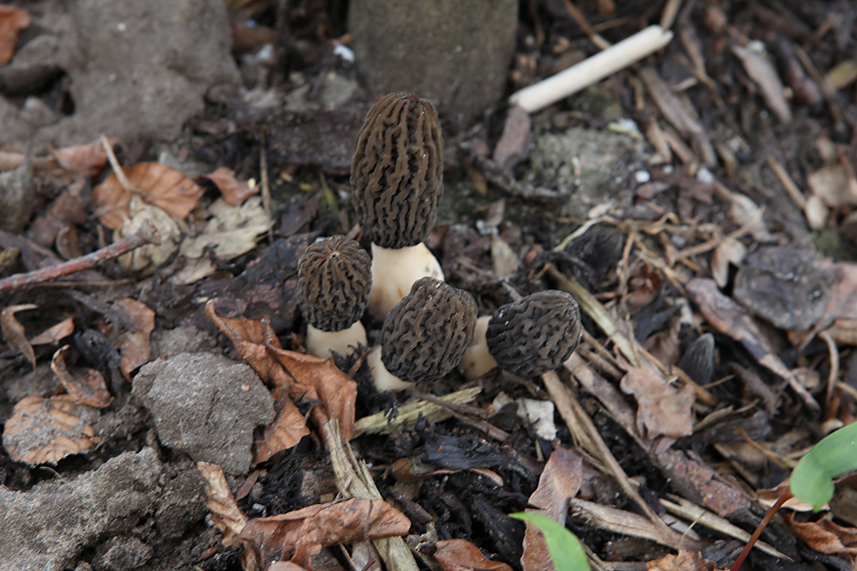 Angekommen an den ersten Mulchplätzen am Parkplatz habe ich auch nach kürzester Zeit die erste Morcheln entdeckt. Voller Enthusiasmus kroch ich halbwegs den Platz entlang, als eine Familie mit 3 kleinen Kindern zu ihrem Auto ging. Die Kinder schauten mich sehr komisch an. Sie dachten wohl auch, was macht dieser Typ da auf dem Boden des Parkplatzes. Ich wollte diese fragenden Augen nicht unwissend lassen und erzählte ihnen, dass ich Morcheln suche. Nachdem ich ihnen ein Beispiel unter die Nase hielt, hatte ich auch schon 3 Helfer!!! SIe schwärmten plötzch aus und entdeckten in kürzester Zeit noch 8 Morcheln für mich.
