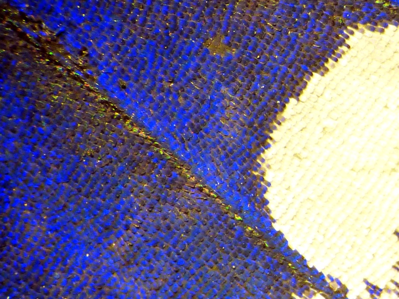 • Ein Schillerfalter (Apatura iris) auf einem Parkplatz hatte ausgefaltert, schillerte aber noch. Grund und Gelegenheit ihn unter dem Binokular zu betrachten und zu fotografieren.