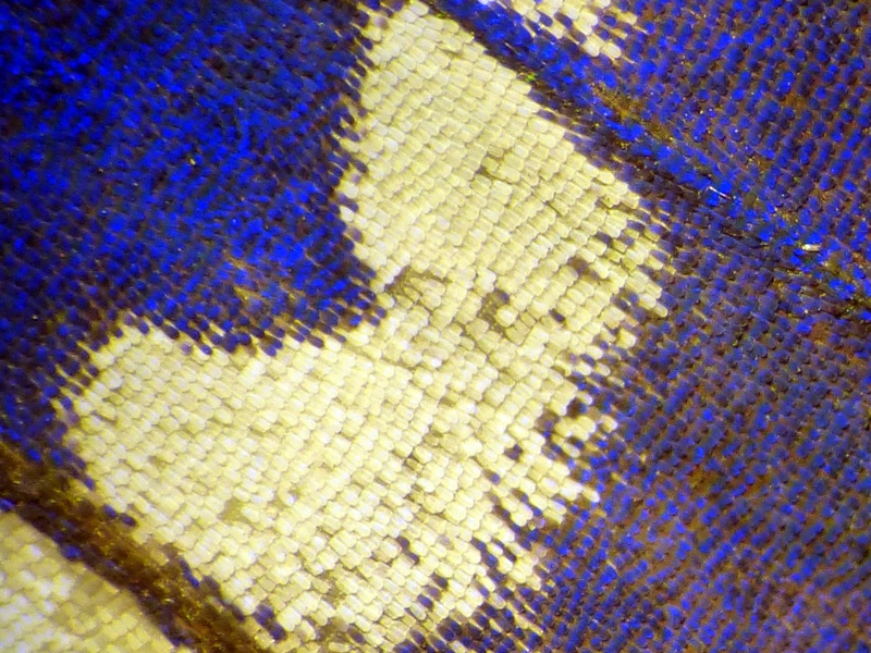 • Ein Schillerfalter (Apatura iris) auf einem Parkplatz hatte ausgefaltert, schillerte aber noch. Grund und Gelegenheit ihn unter dem Binokular zu betrachten und zu fotografieren.
