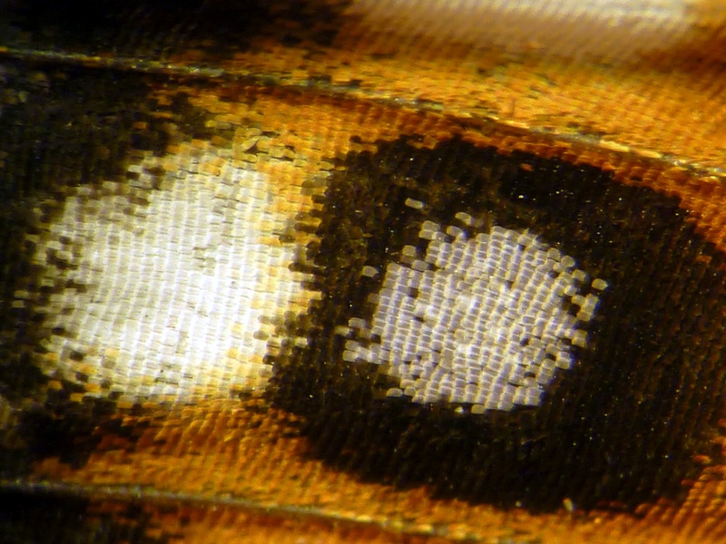 • Ein Schillerfalter (Apatura iris) auf einem Parkplatz hatte ausgefaltert, schillerte aber noch. Grund und Gelegenheit ihn unter dem Binokular zu betrachten und zu fotografieren.