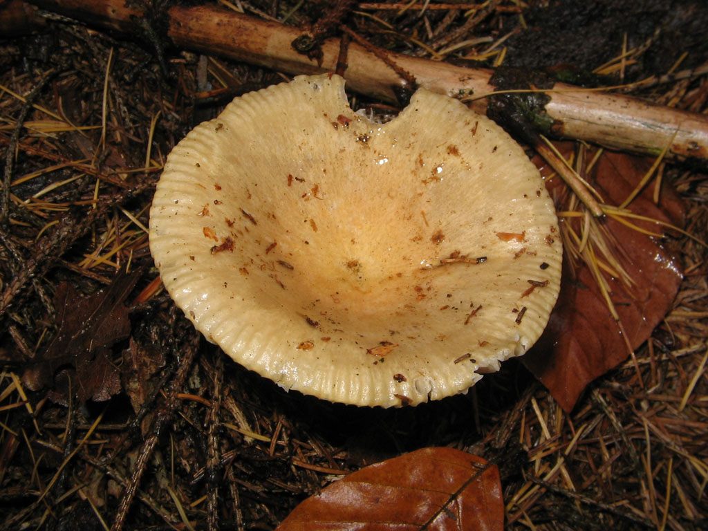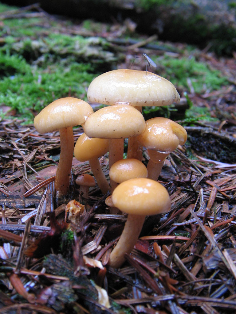 Und wenn ich schonmal in schauernden Regenfällen unterwegs war, musste ich natürlich meine nicht unweit gelegene Semmelstoppelpilzstelle (Hydnum ...) aufsuchen. Und trotz gegenteiliger Erwartungen sah ich sie schon vom Weg aus orange aufblitzen. Erstaunlicher Weise sogar frische Fruchtkörper, die allerdings durch den Regen größtenteils ziemlich aufgeweicht und aufgedunsen waren.