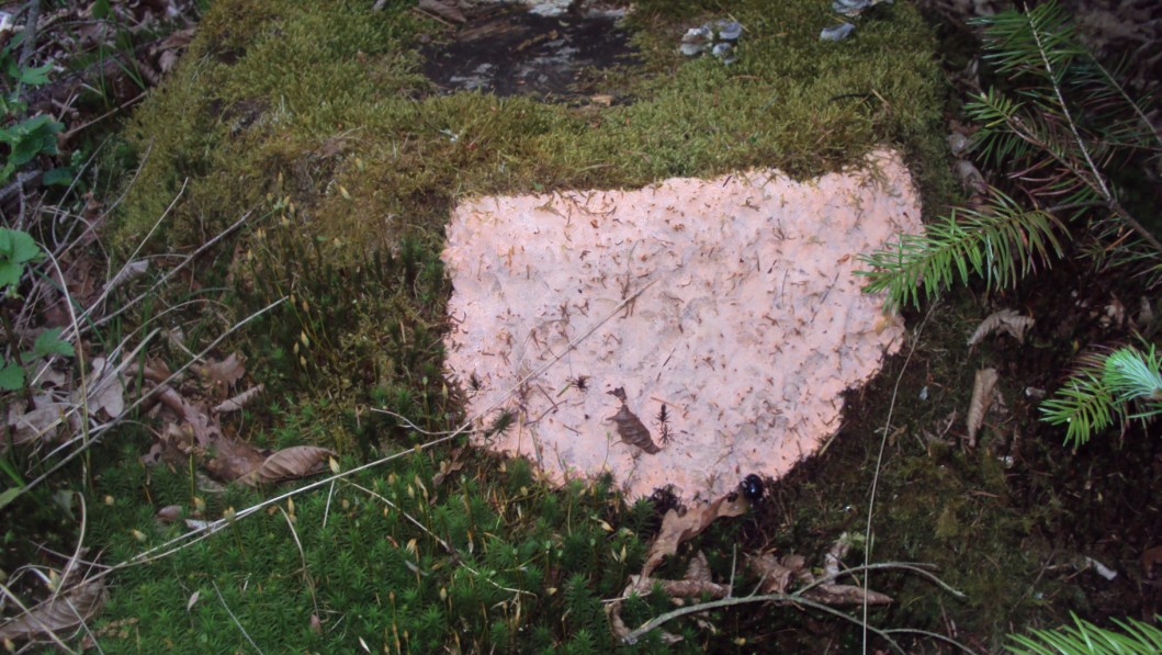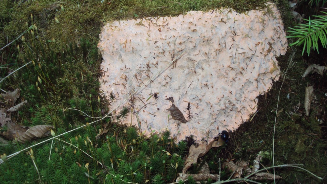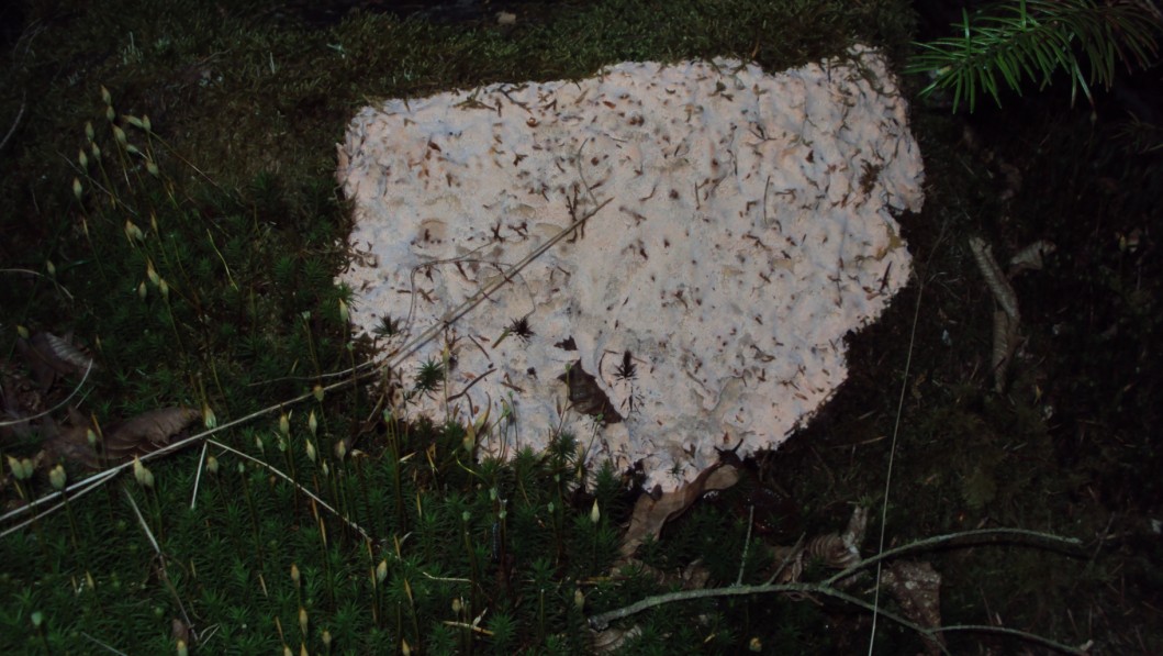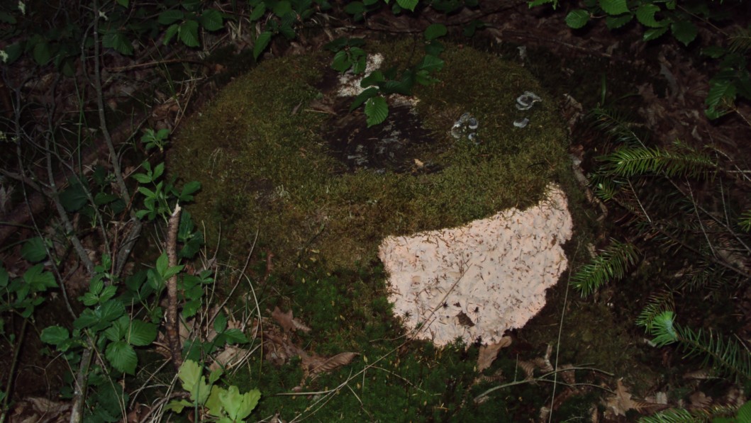 Vor einer Woche habe ich diesen seltsamen Pilz im Mischwald gefunden, in der Umgebung wachsen Buche, Ahorn, Eiche und auch Fichten, er ist etwa dreißig auf zwanzig Zentimeter und etwa drei Zentimeter dick, riecht angenehm, eben nach Pilz, den Baumstumpf kann ich leider nicht mehr bestimmen, aber in der näheren Umgebung sind viele Fichten abgeholzt worden.