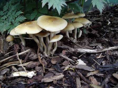 Habe heute im Garten diese Pilze entdeckt. Sie wachsen auf Rindenmulch. Der Stiehl ist recht Glatt und fest. Sie riechen recht angenehm.