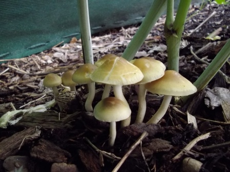 Habe heute im Garten diese Pilze entdeckt. Sie wachsen auf Rindenmulch. Der Stiehl ist recht Glatt und fest. Sie riechen recht angenehm.